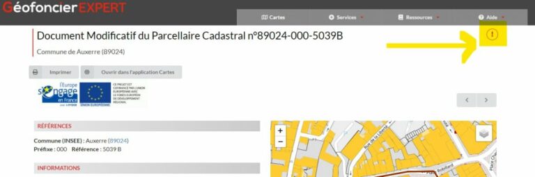 Si vous repérez une erreur sur l’un des documents consultés dans le portail Géofoncier, faites-en le signalement grâce à ce bouton, présent en haut à droite de toutes les fiches DMPC par exemple :